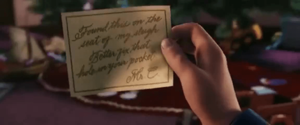Upon finally reaching the North Pole Hero Boy, Hero Girl and Billy find themselves within the inner workings of what appears to be either Santa’s workshop or a warehouse. There Billy finds his gift and they all end up in Santa’s sack where they also discover Know-It-All. All four are returned to the Conductor where he finishes stamping out their golden tickets to reveal an appropriate word for each child. And Steven Tyler, dressed as an elf, sings.